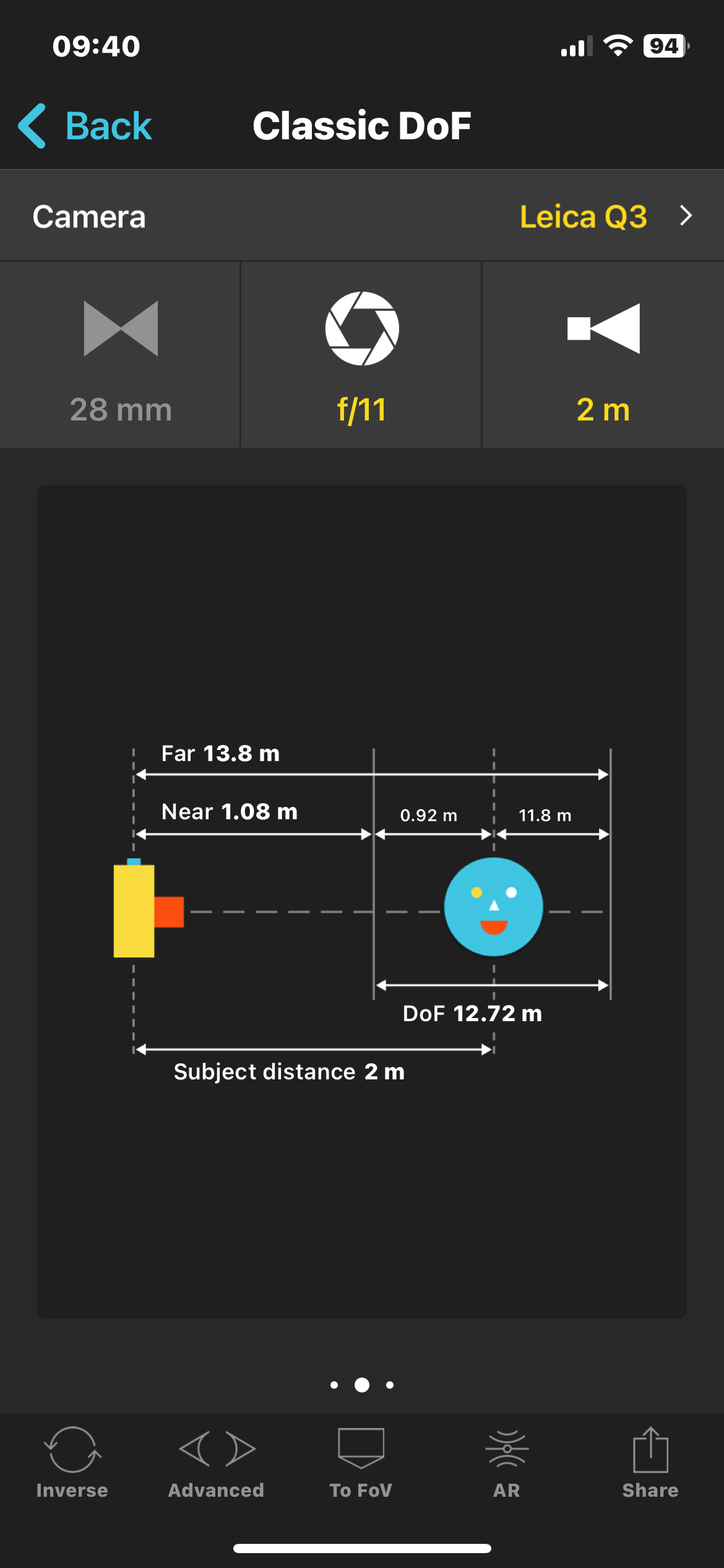Let's say that our subject is exactly 2m away from us. With the Leica Q3 at f/1.7 focusing on the subject our Depth of Field will be 0.52m. This why we call it shallow Depth of Field. Only 23cm before 2m, and 29cm after 2m is going to be sharp. Everything else will be out of focus.